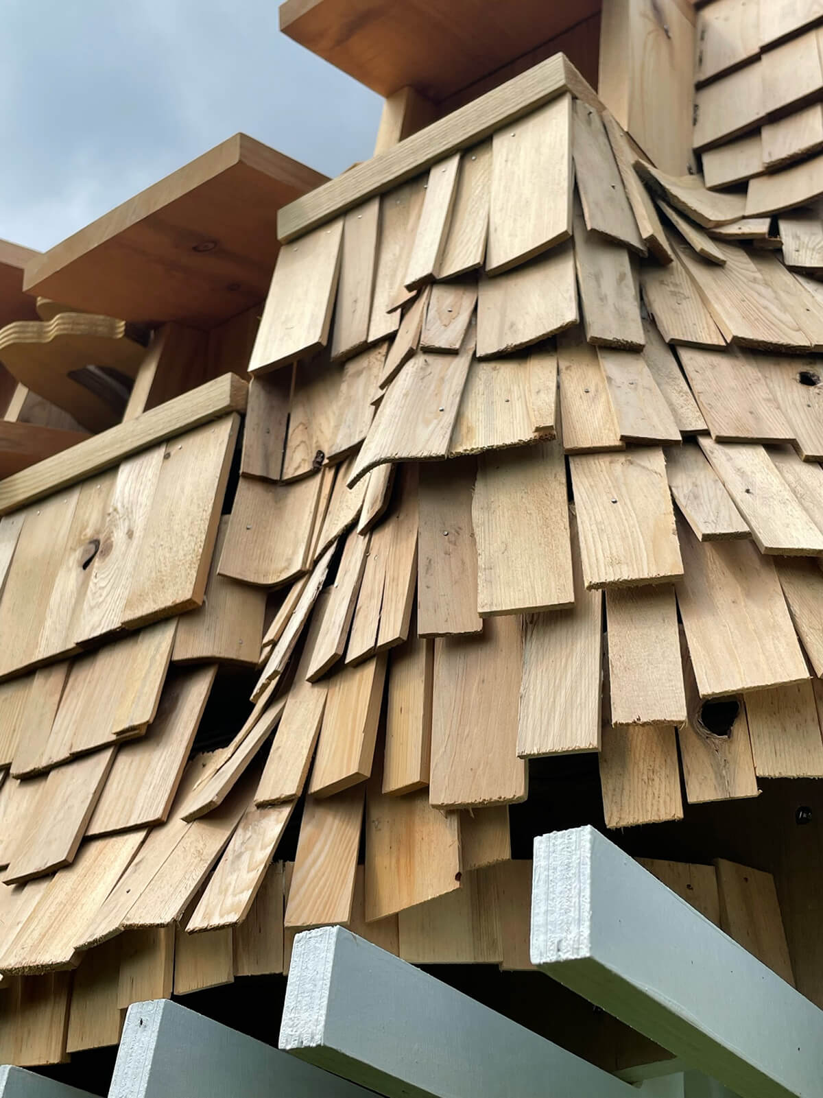 For Our Neighbors is a welcome space for synanthropic birds – that is, bird species that often live among and rely upon structures associated with human habitation. Aiming to draw attention to some of the birds that co-exist with us as neighbors, the bird house is conceived of as analogous to a roof system, enhanced with vertical and covered platform surfaces for Barn Swallow nest-building, or to serve as nesting sites for House Finches, Mourning Doves, and other birds that utilize ledges. Exaggerated rain gutters can potentially be habitation sites for Carolina Wrens, who make homes using drainpipes and even abandoned pots. Cedar shingles line the undulating roof structure, occasionally revealing gaps for birds to enter between shingles.