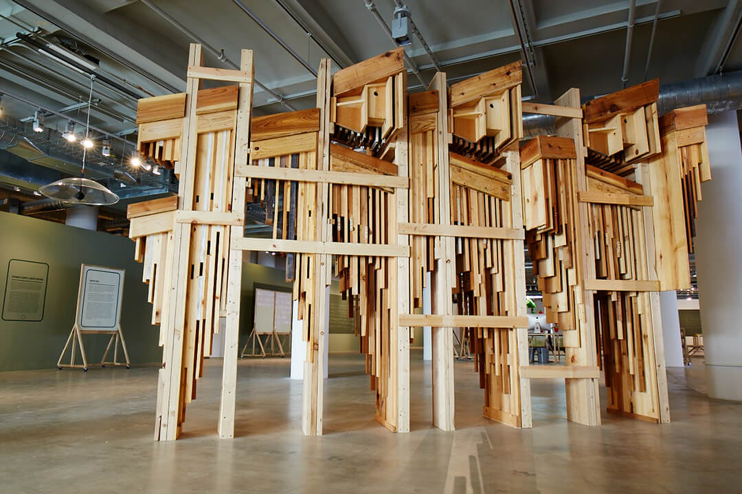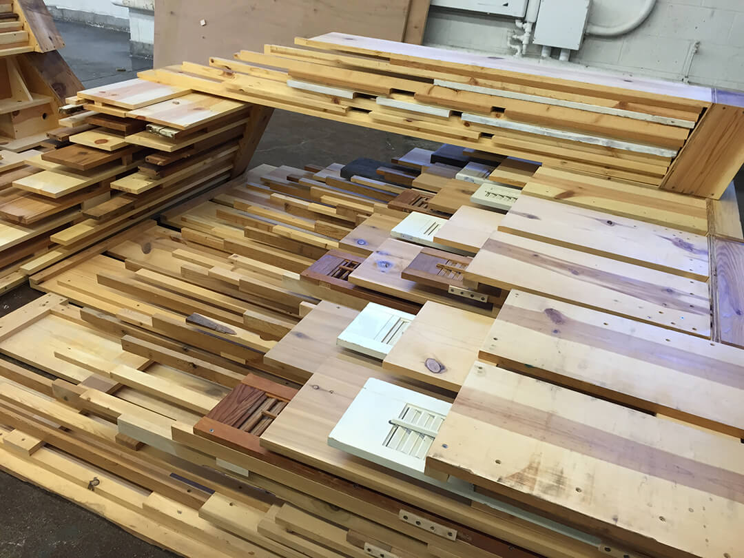 Built from cedar, pine, and salvaged building materials, the prototype’s primary features include thin crevices of space which allow for occupation by bats that typically might roost in attics, wall cavities, and other building features. Use of rough cut wood and textured material, such as recycled window shutters, enable bats to better land and climb into the cavities above. The layering and mass of the wood helps absorb heat during the day and provides better insulation and thermal consistency, which is important for bat dwellings. The prototype also includes bird nesting boxes and surfaces that are constructed for swallows and other cliff dwelling birds.