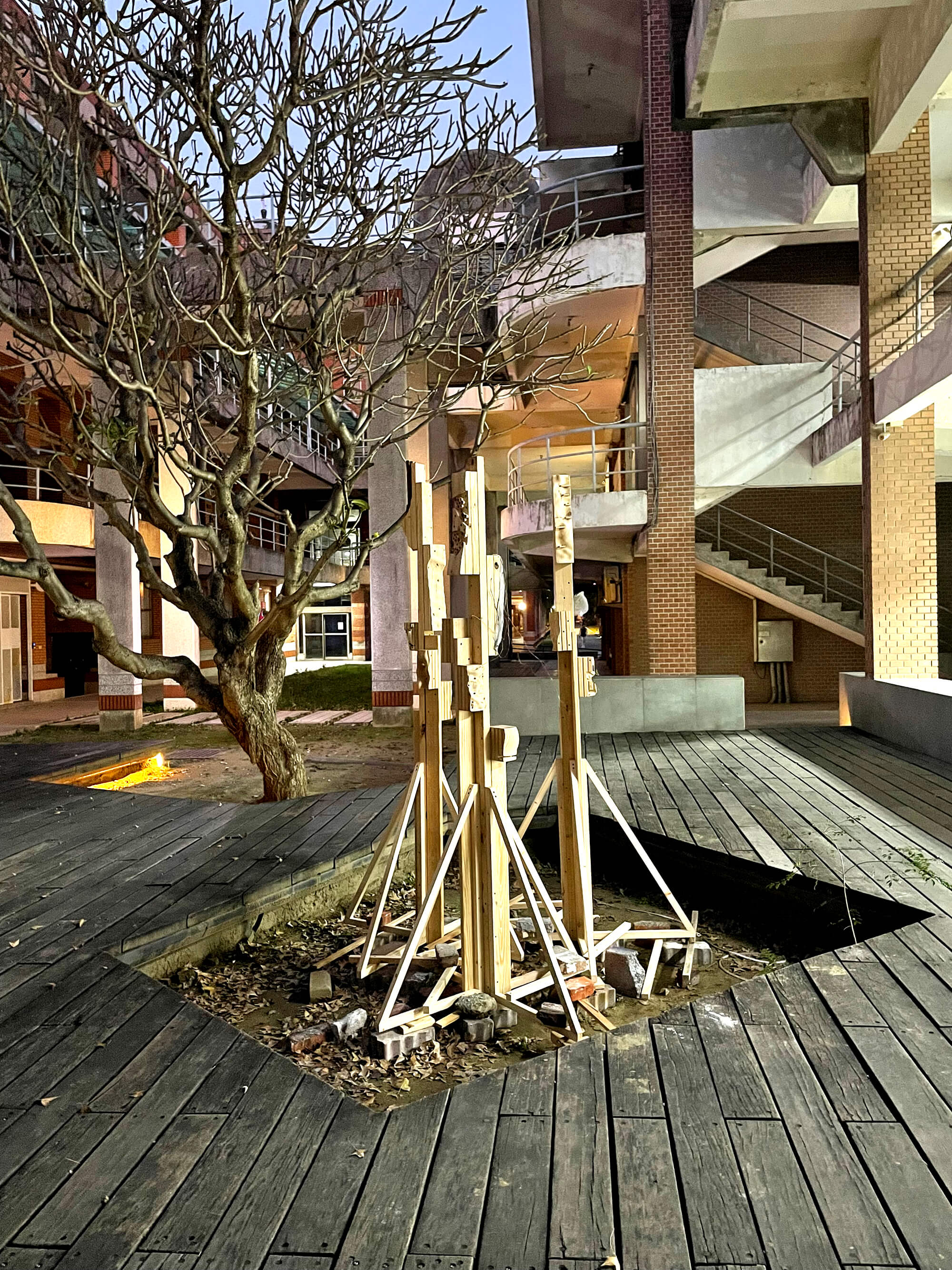 The NCKU Habitecture project is a temporary installation supporting multispecies habitat boxes, designed and built through a workshop led by Joyce Hwang at the National Cheng Kung University’s Department of Architecture. Engaging students in ideas around enhancing urban biodiversity and including fauna in design, the workshop encouraged students to learn about a number of species that inhabit Taiwan, and specifically the Tainan region. We were particularly interested in urban pollinators, specifically considering solitary bee species. Through a process of co-design, students worked together to construct the installation structure, mount their boxes on the structure, and arrange the structures in-situ in the NCKU Department of Architecture courtyard.