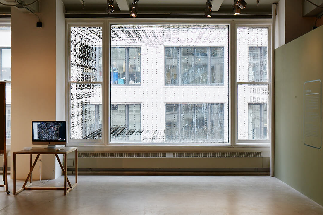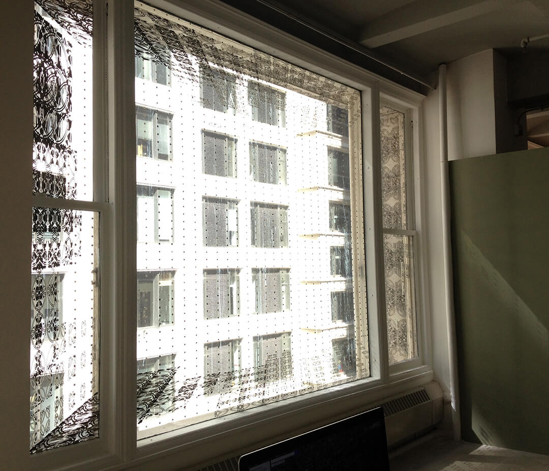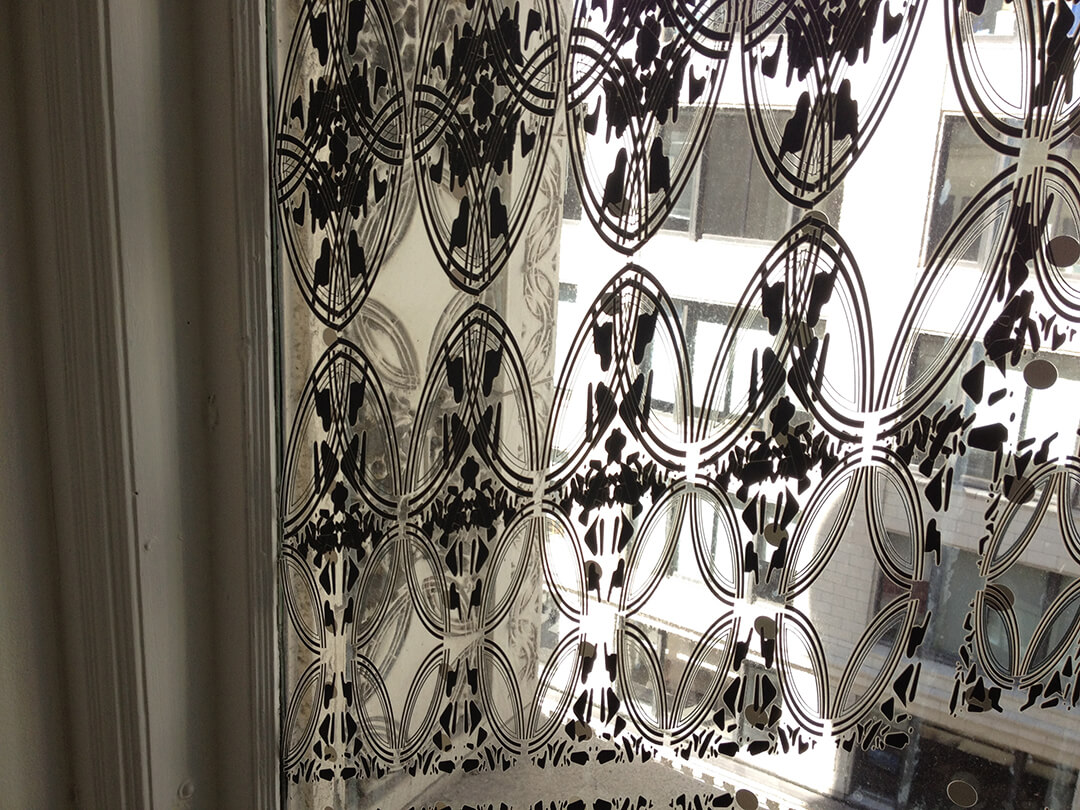 The most significant cause of bird mortality in urban areas is collision with glass, as birds in flight are often unable to distinguish clear glass from open air. No Crash Zone is a temporary renovation of a window in the Carson, Pirie, Scott Building to make visible the logics of bird-strike prevention. The project explores how we can consider the subjectivity of non-human species, while still enhancing human desires, such as views from inside out. With a nod to the tiling pattern framing the building’s windows, the project aims to create visual interference patterning through the deployment of graphic ornament, reconsidering its role beyond agendas of aesthetic composition. The installation also taps into the fundamental construction of human vision by overtly referencing the one-point Renaissance perspective, as well as more contemporary optical tactics such as camouflage through pixilation.