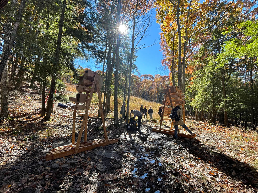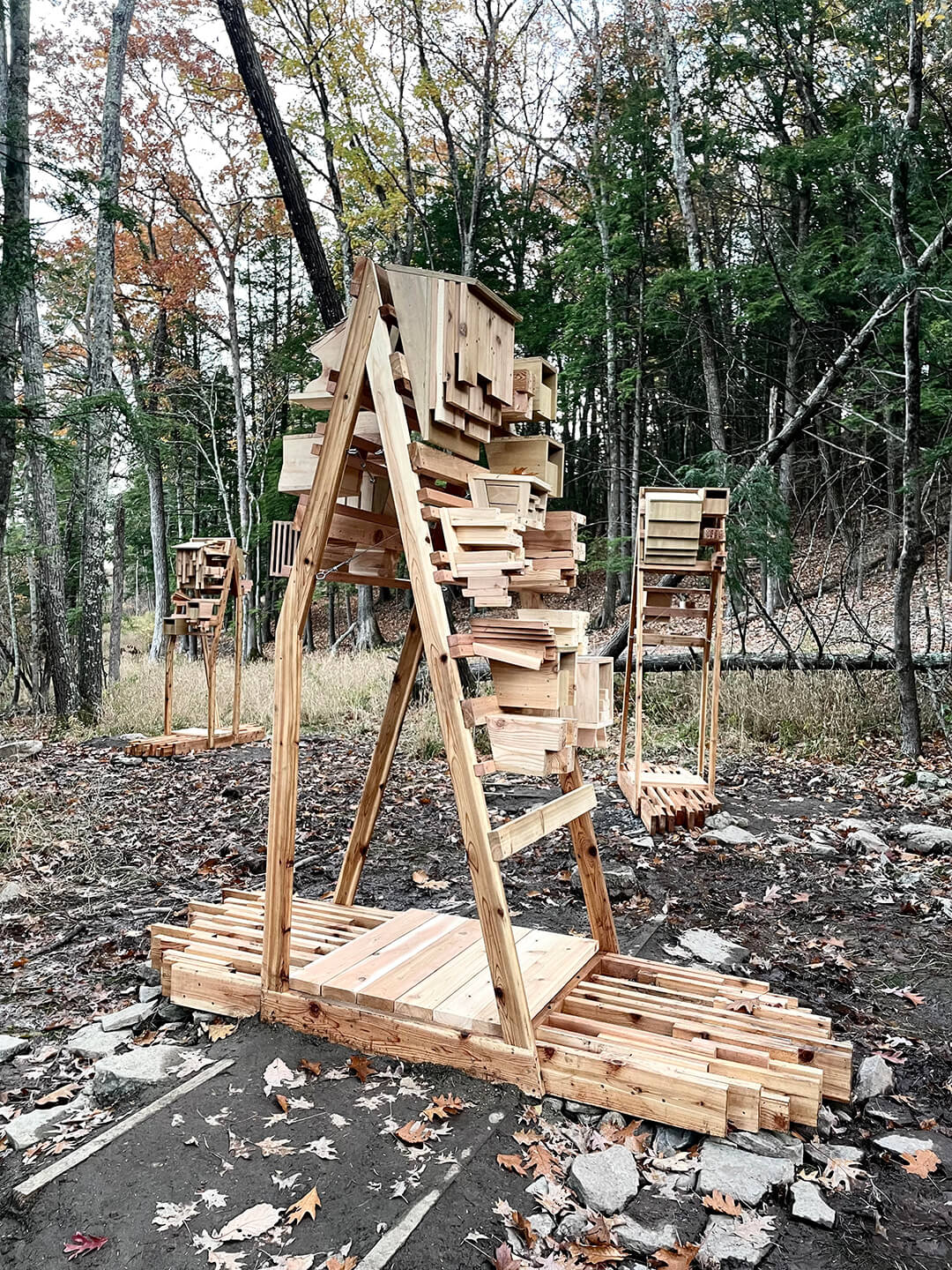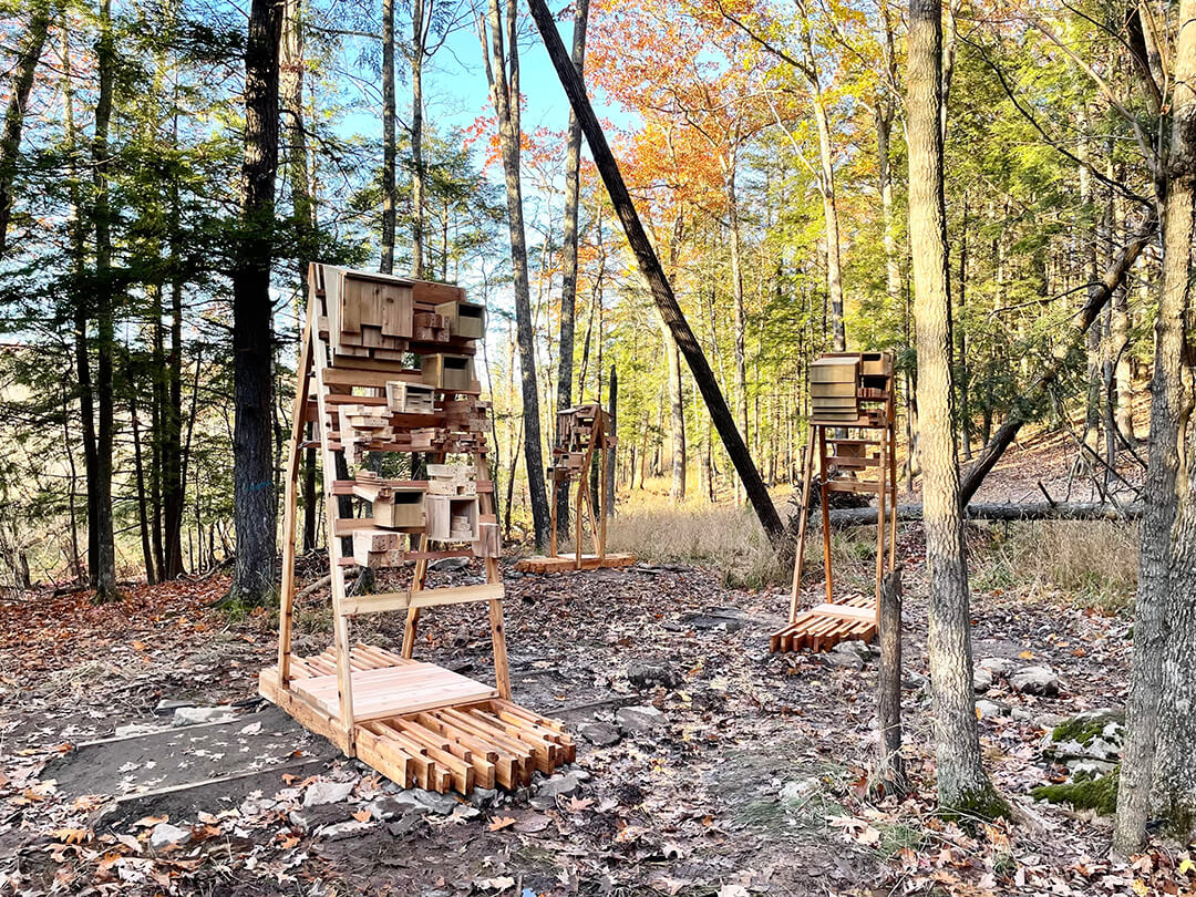 The Piaule Multispecies Habitats is a series of three structures, designed as armatures to support a variety of bird nesting boxes, bat houses, and insect habitat boxes. The installation is located along a walking trail, and designed with attention to local wildlife in the Catskill region. The project was commissioned as part of the Piaule Multispecies Fellowship that was awarded to Joyce Hwang by Pratt Institute’s School of Architecture in 2022.
