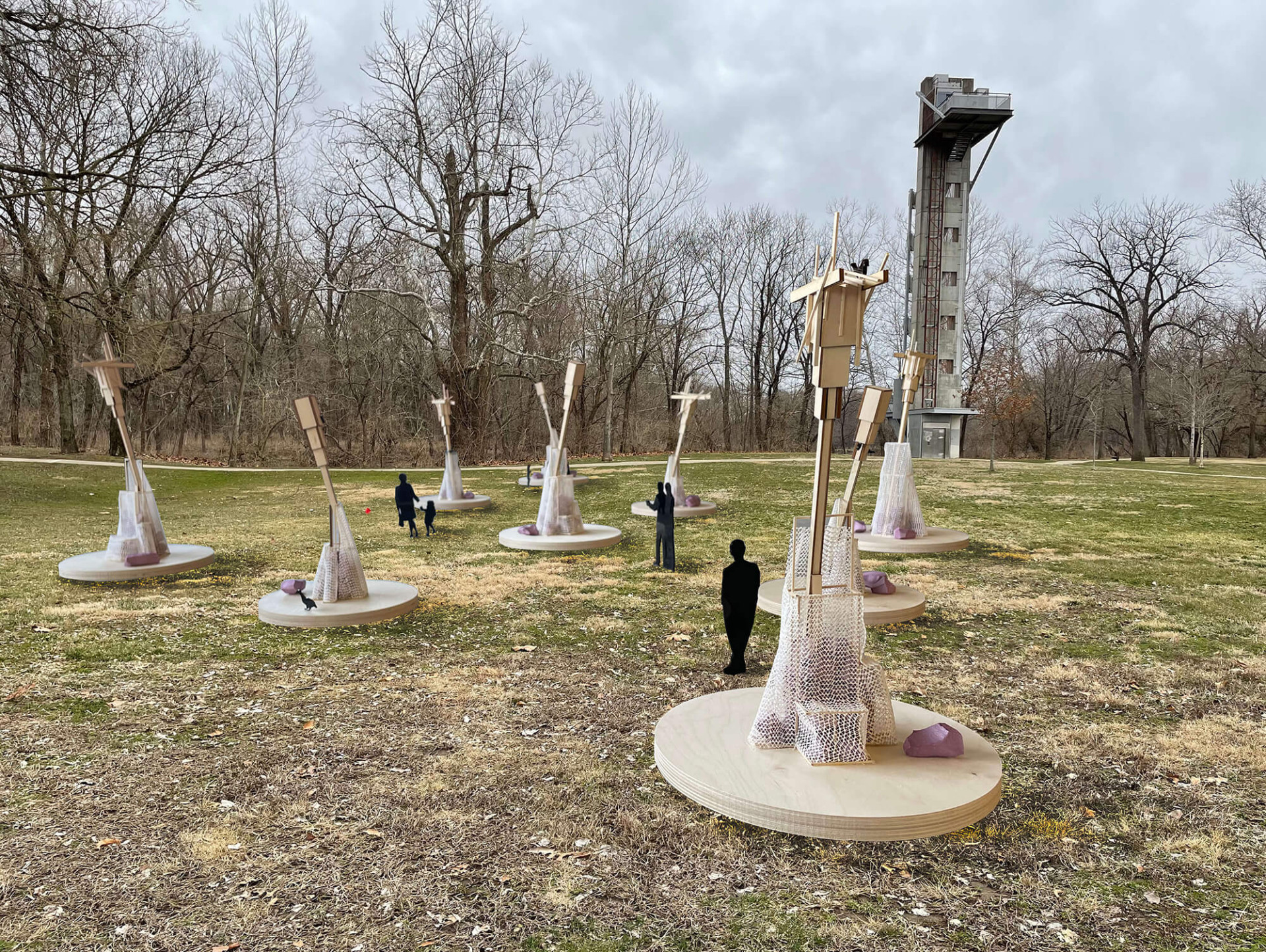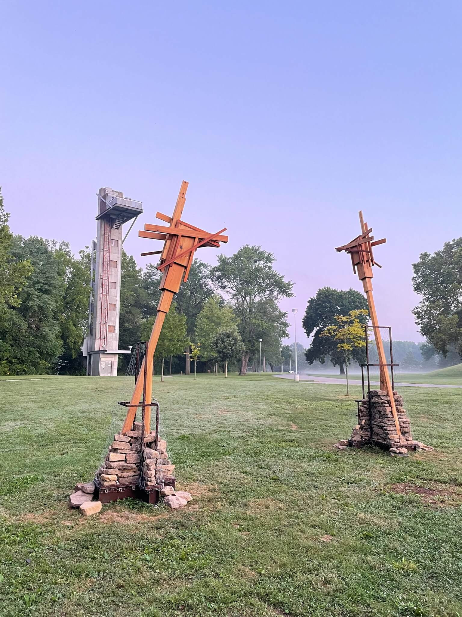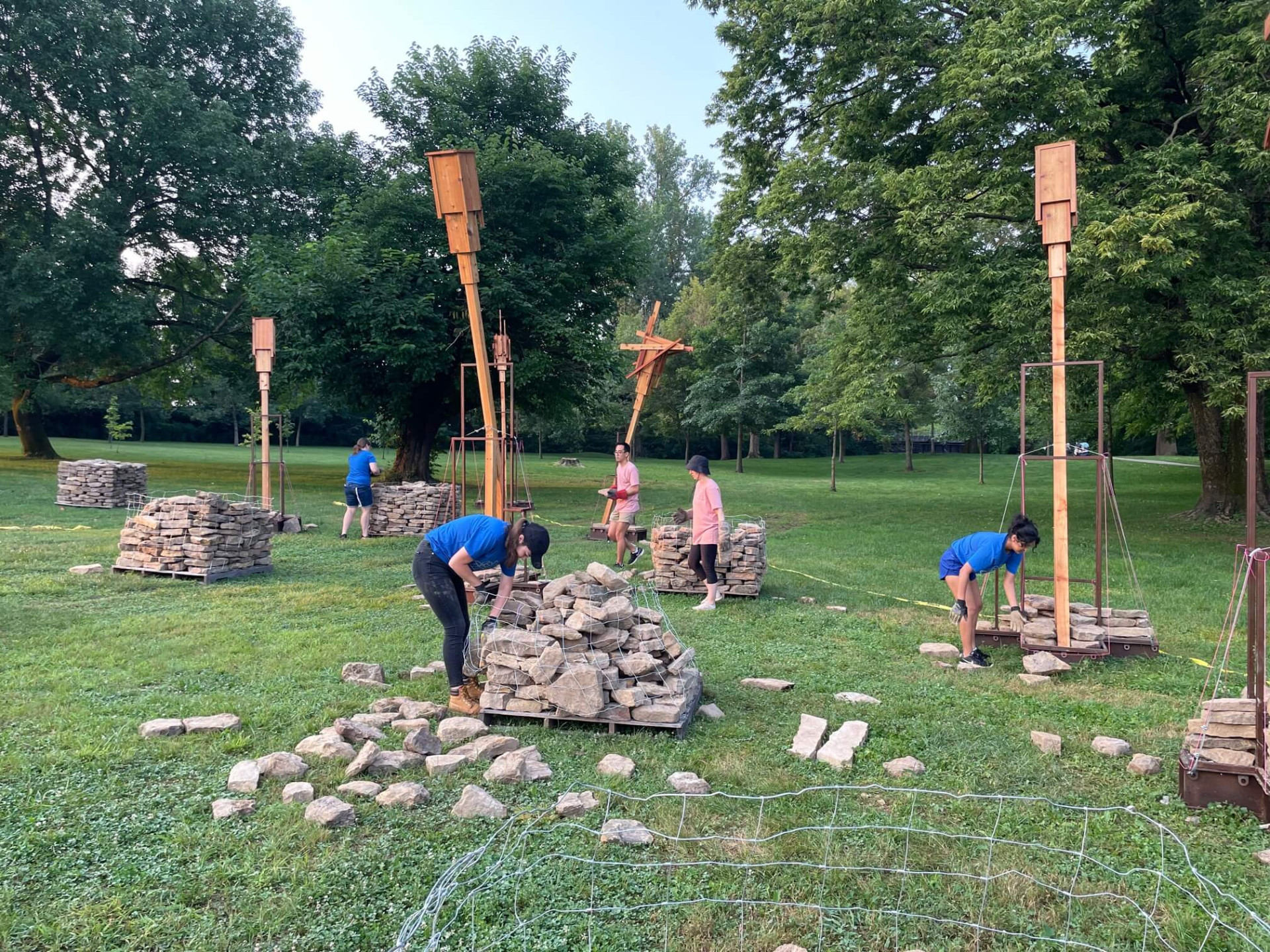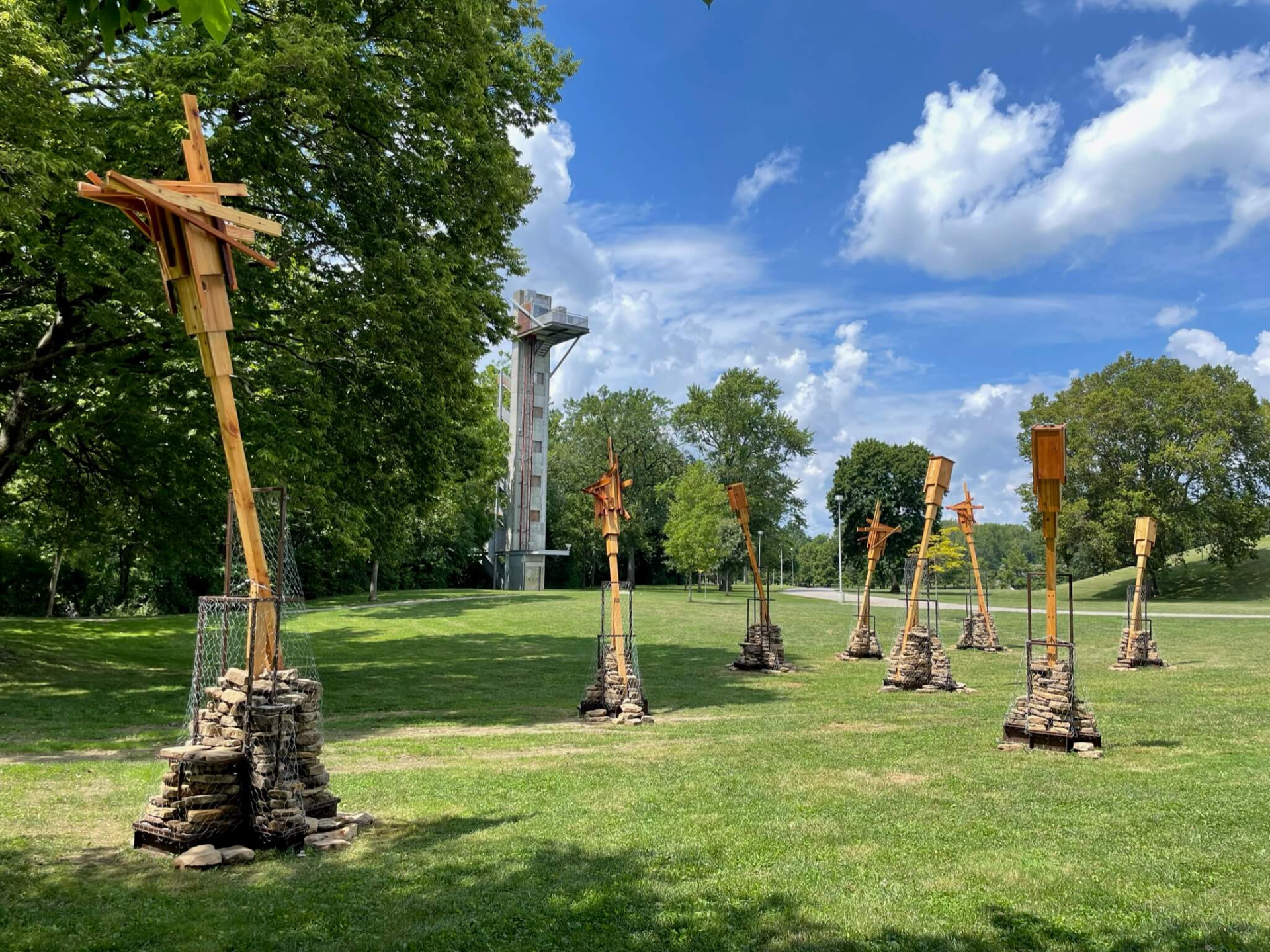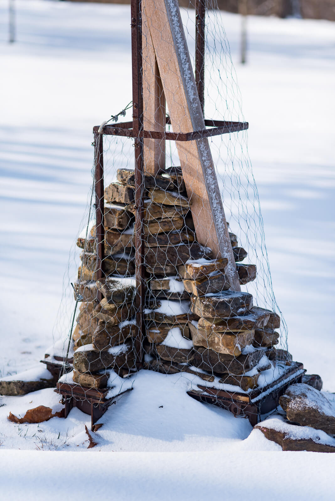 Made out of Indiana hardwoods, the installation provides bird perches and functions similarly to the bat houses used by the endangered Indiana Bat—one of 13 bat species in Indiana. Dry-stacked stone mounds offer habitat for smaller terrestrial creatures.