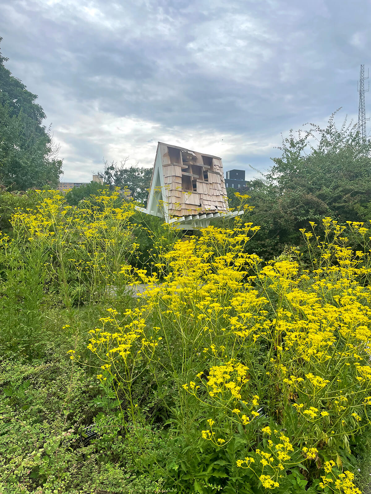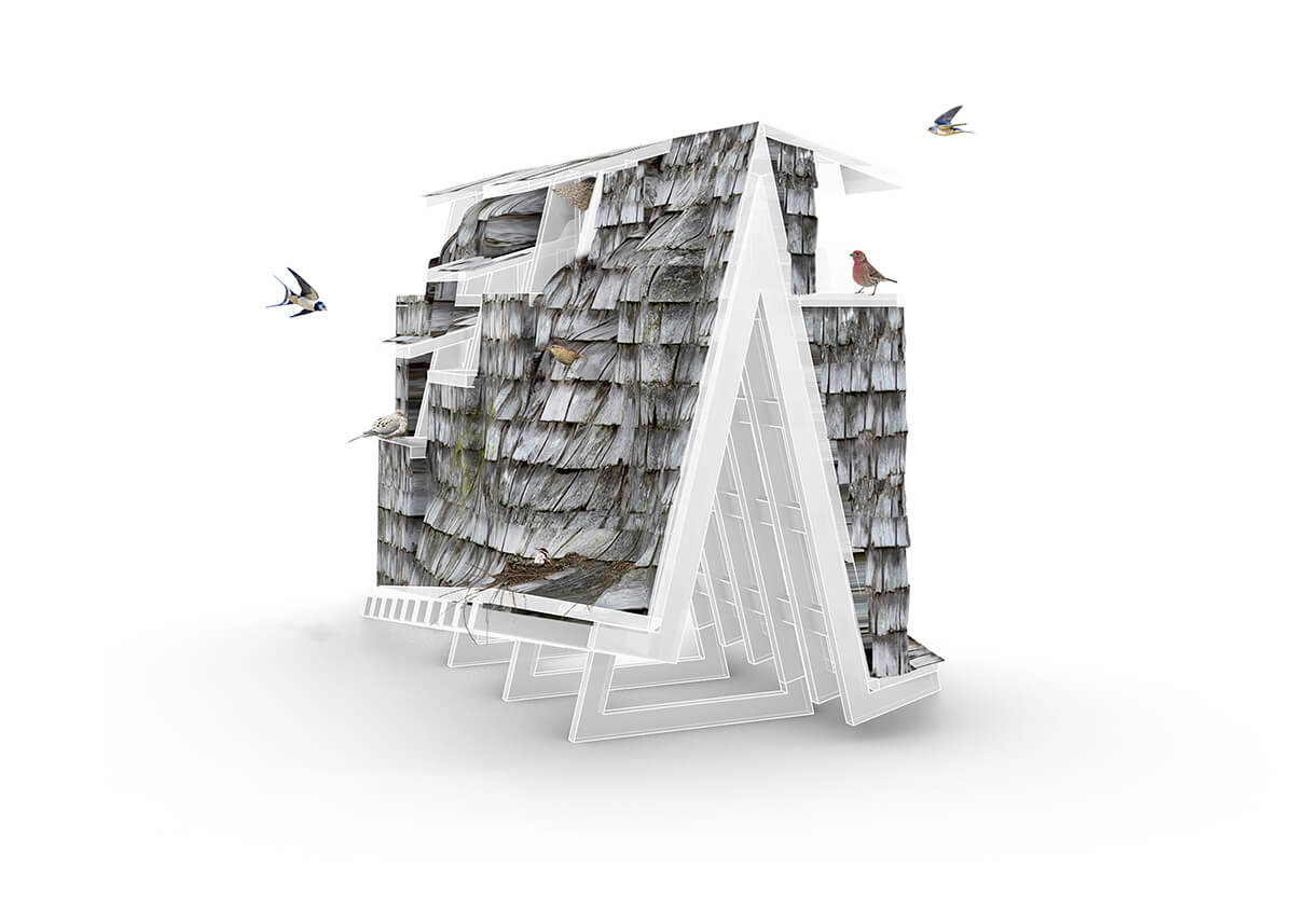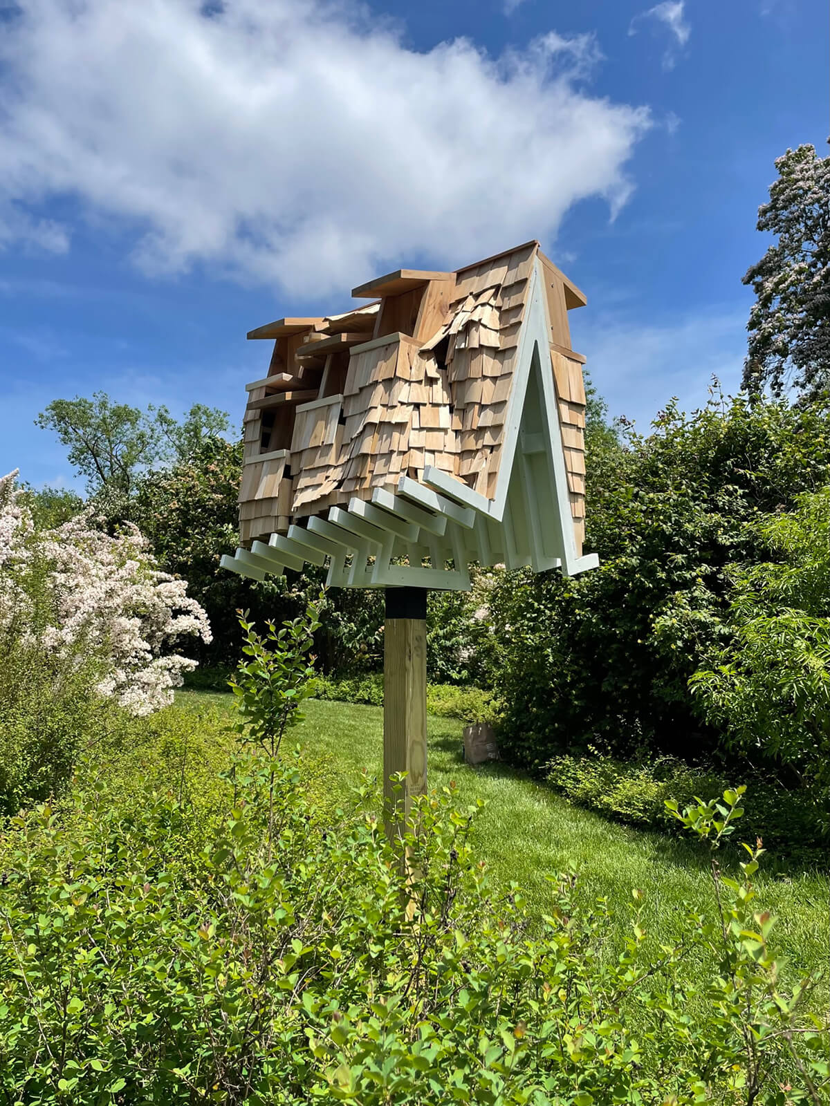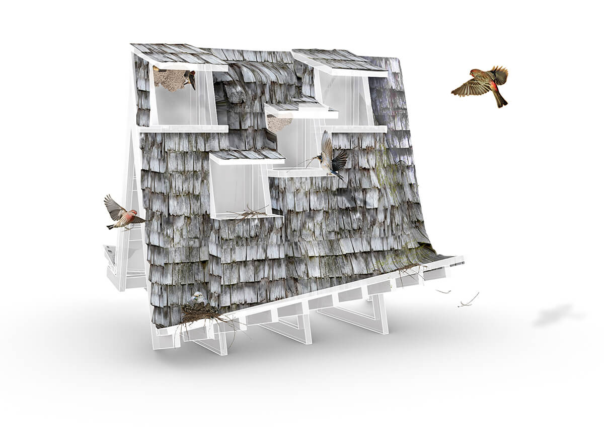 For Our Neighbors is a welcome space for synanthropic birds – that is, bird species that often live among and rely upon structures associated with human habitation. Aiming to draw attention to some of the birds that co-exist with us as neighbors, the bird house is conceived of as analogous to a roof system, enhanced with vertical and covered platform surfaces for Barn Swallow nest-building, or to serve as nesting sites for House Finches, Mourning Doves, and other birds that utilize ledges. Exaggerated rain gutters can potentially be habitation sites for Carolina Wrens, who make homes using drainpipes and even abandoned pots. Cedar shingles line the undulating roof structure, occasionally revealing gaps for birds to enter between shingles.