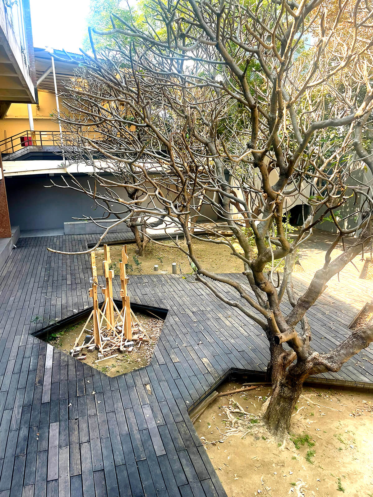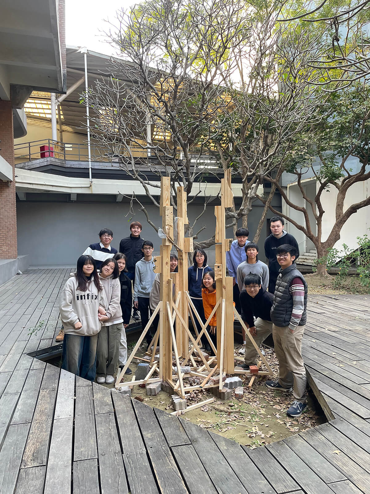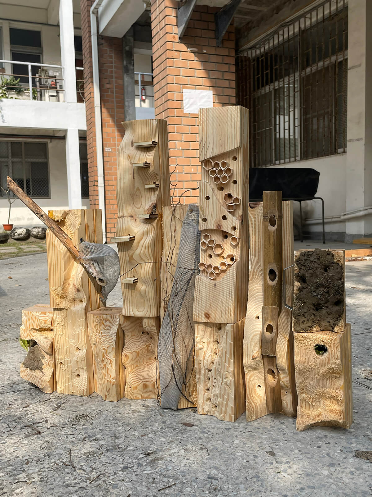 The NCKU Habitecture project is a temporary installation supporting multispecies habitat boxes, designed and built through a workshop led by Joyce Hwang at the National Cheng Kung University’s Department of Architecture. Engaging students in ideas around enhancing urban biodiversity and including fauna in design, the workshop encouraged students to learn about a number of species that inhabit Taiwan, and specifically the Tainan region. We were particularly interested in urban pollinators, specifically considering solitary bee species. Through a process of co-design, students worked together to construct the installation structure, mount their boxes on the structure, and arrange the structures in-situ in the NCKU Department of Architecture courtyard.