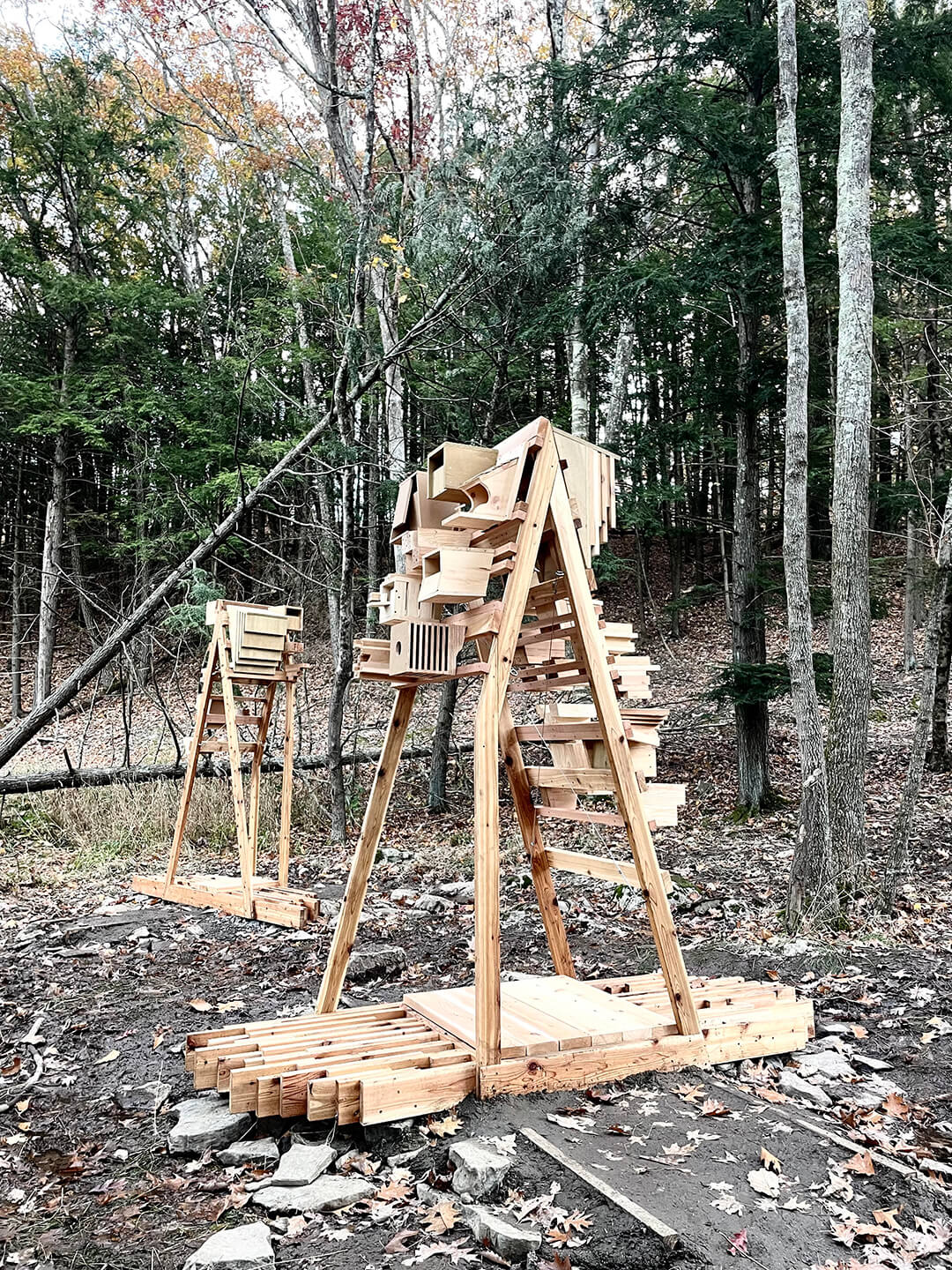 The Piaule Multispecies Habitats is a series of three structures, designed as armatures to support a variety of bird nesting boxes, bat houses, and insect habitat boxes. The installation is located along a walking trail, and designed with attention to local wildlife in the Catskill region. The project was commissioned as part of the Piaule Multispecies Fellowship that was awarded to Joyce Hwang by Pratt Institute’s School of Architecture in 2022.