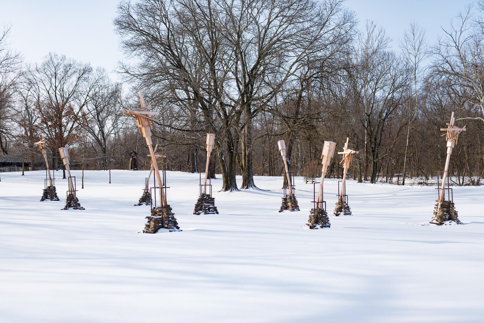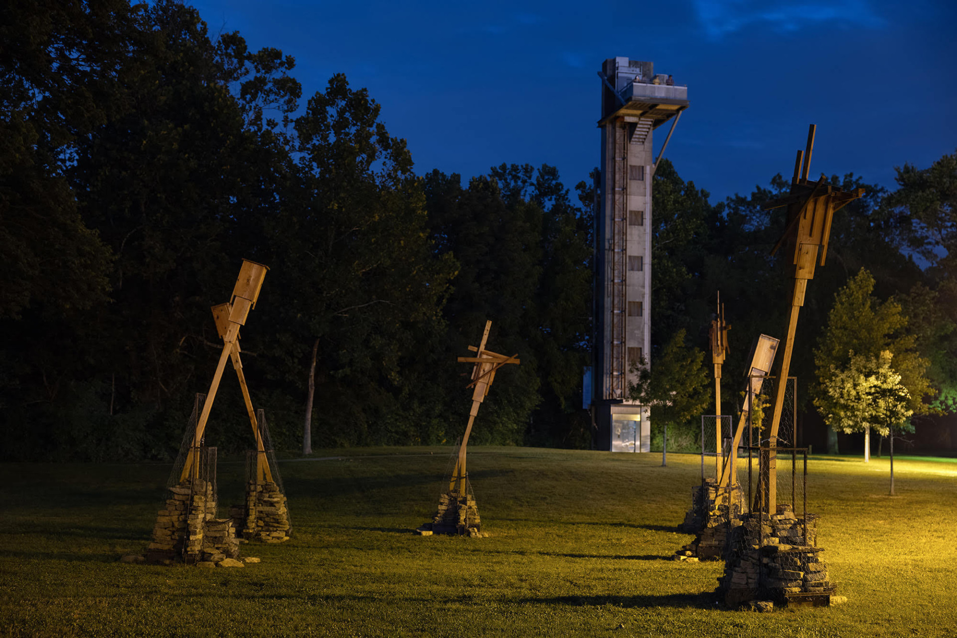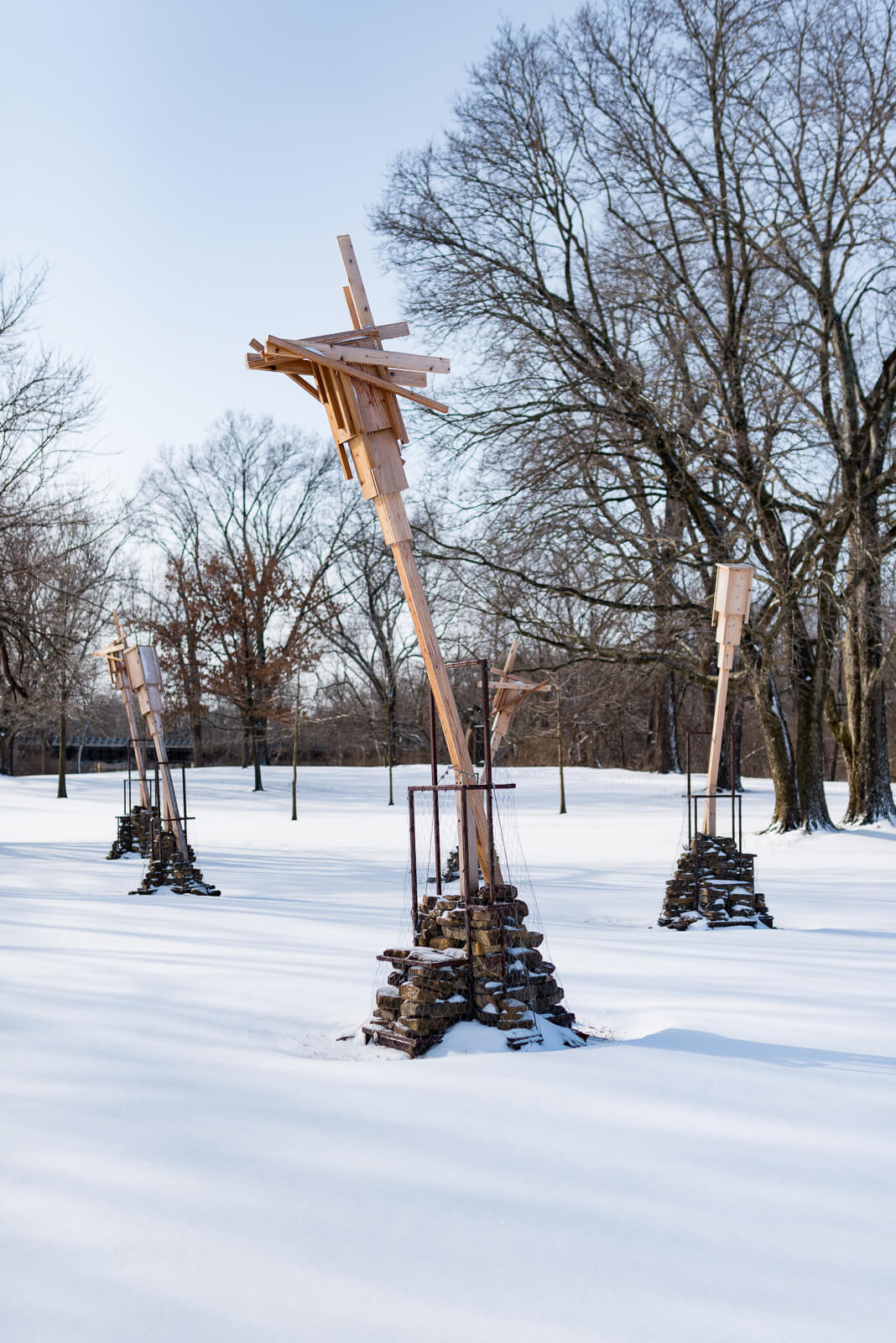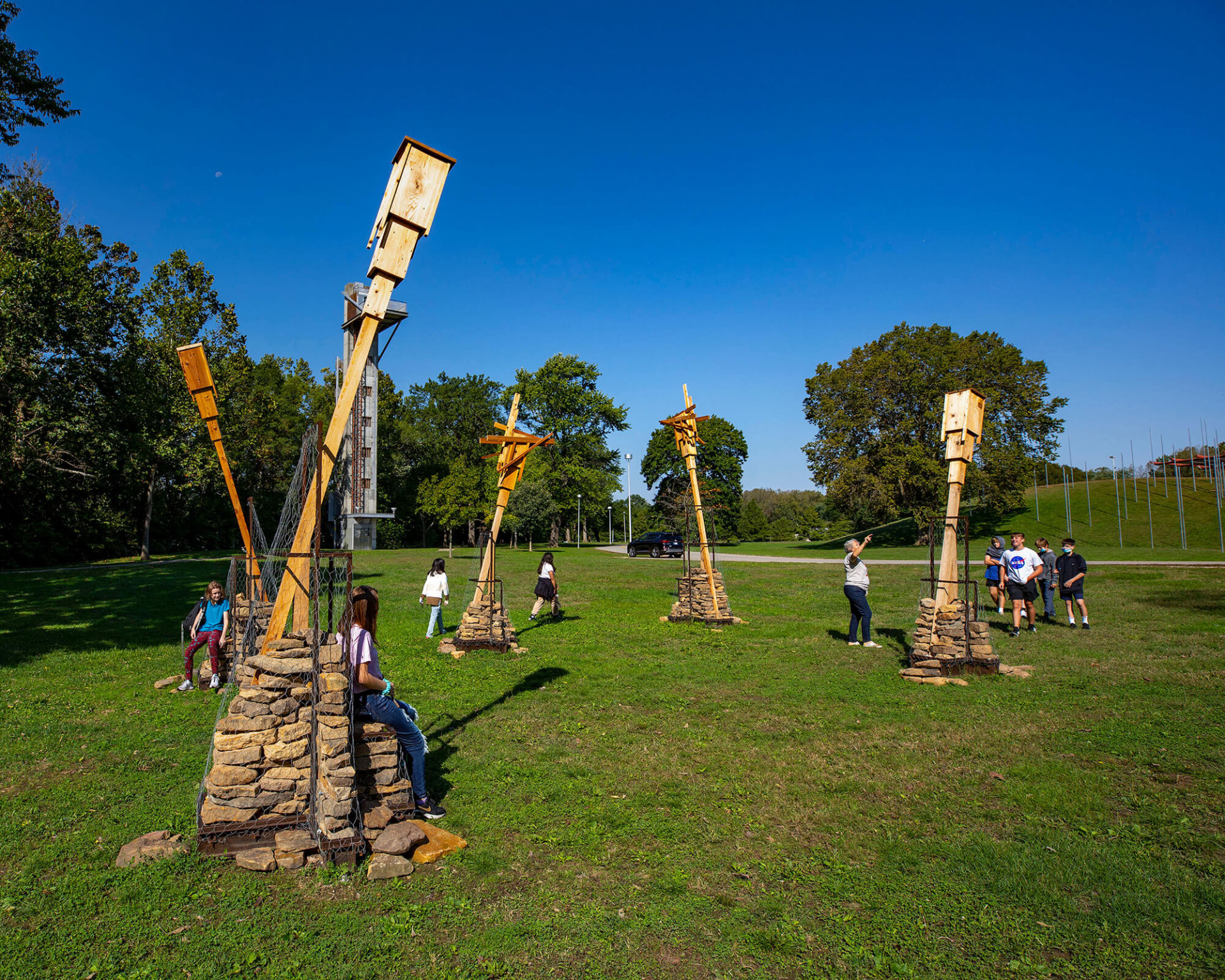 Made out of Indiana hardwoods, the installation provides bird perches and functions similarly to the bat houses used by the endangered Indiana Bat—one of 13 bat species in Indiana. Dry-stacked stone mounds offer habitat for smaller terrestrial creatures.
