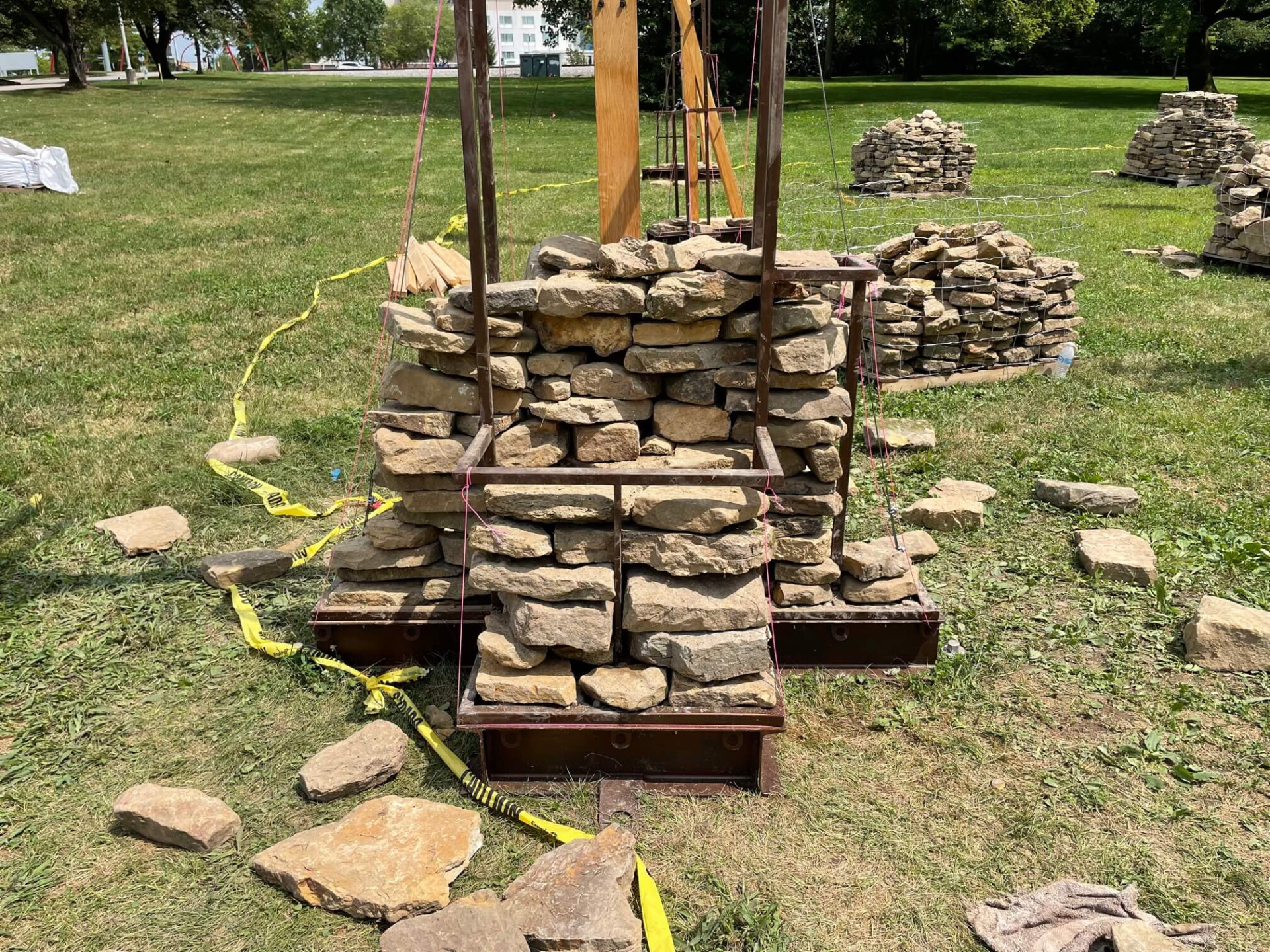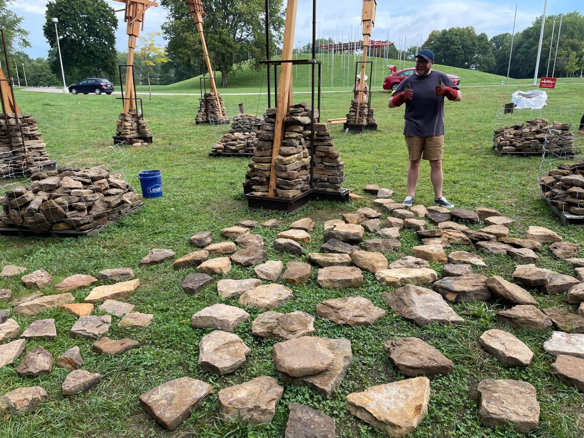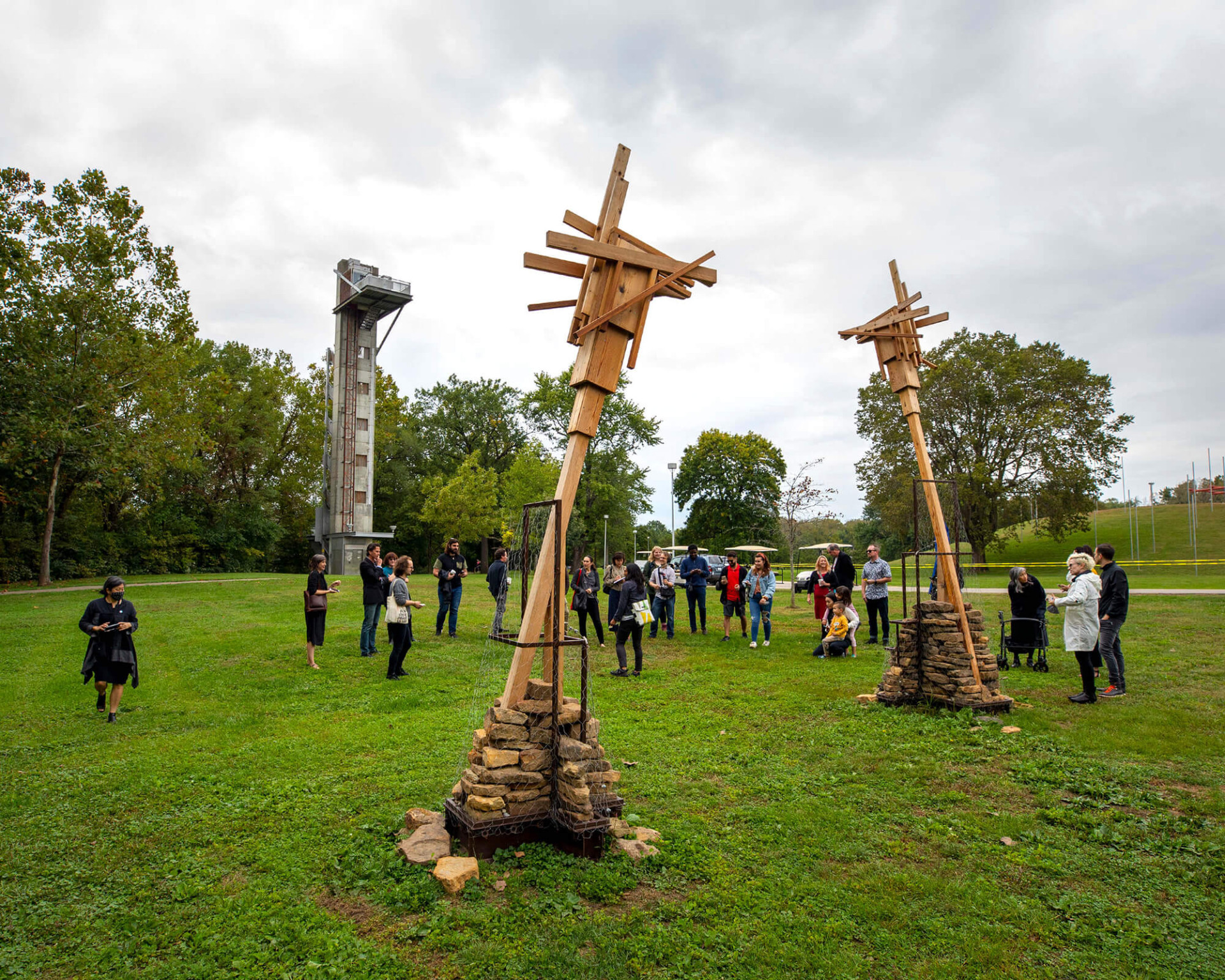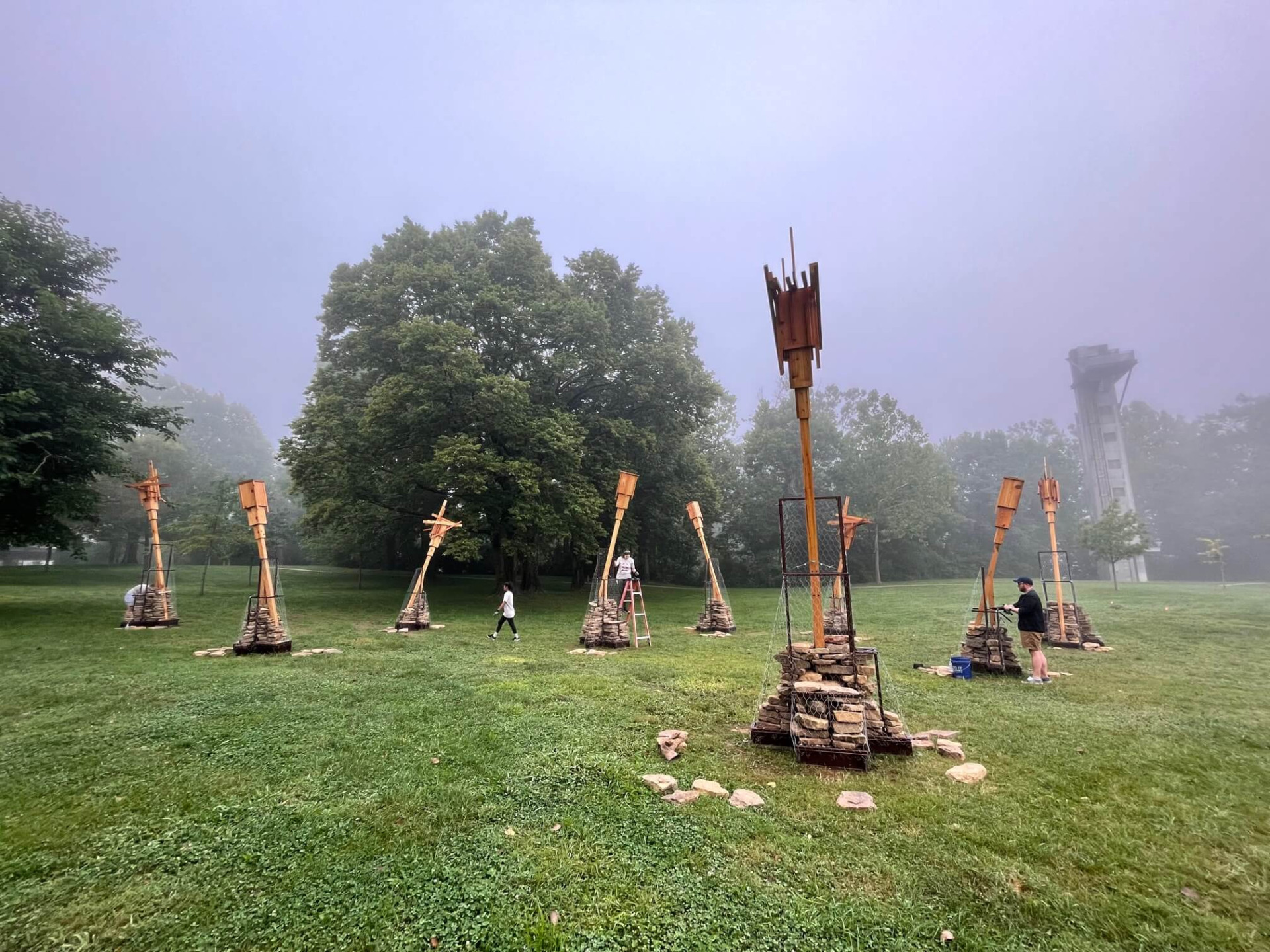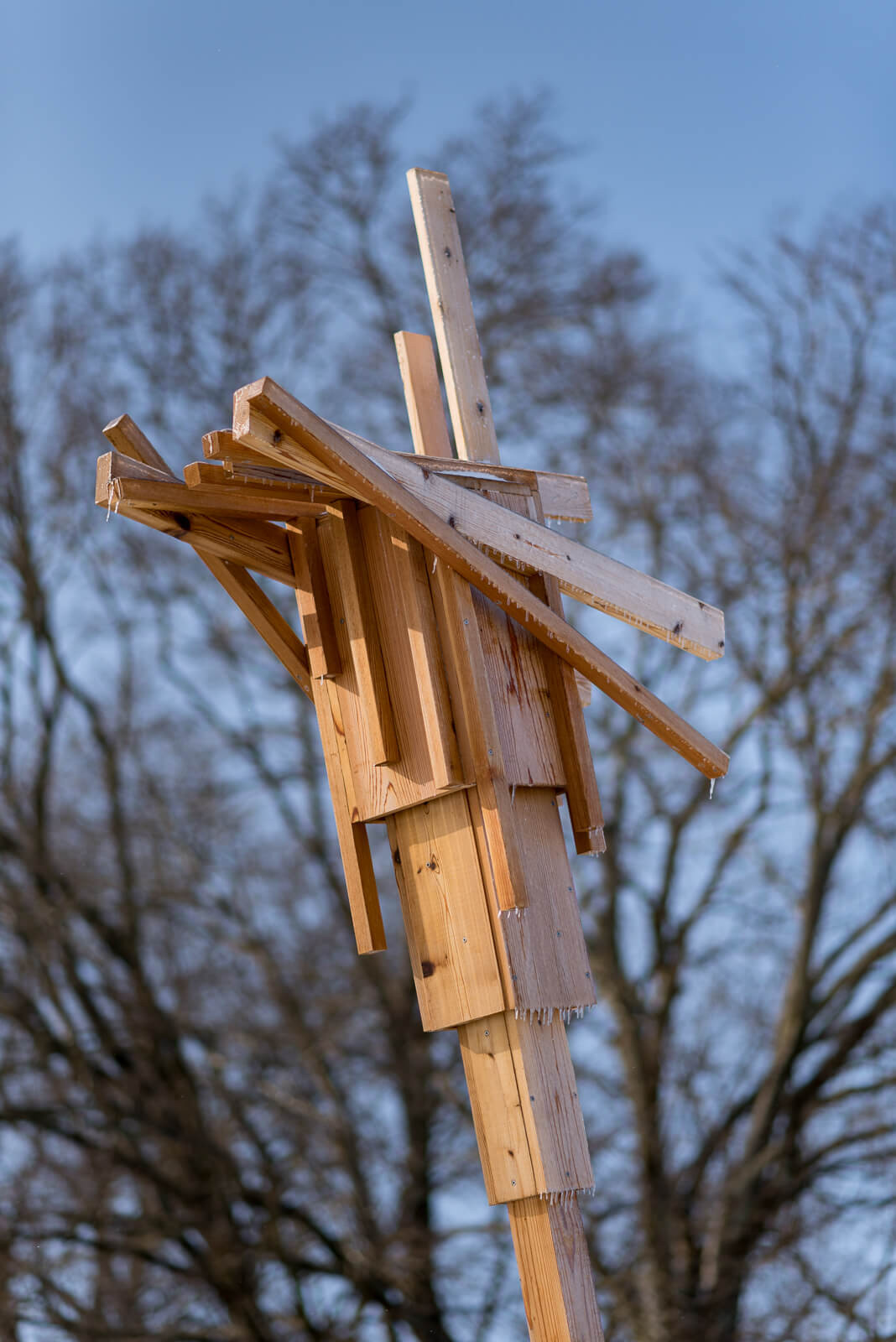Made out of Indiana hardwoods, the installation provides bird perches and functions similarly to the bat houses used by the endangered Indiana Bat—one of 13 bat species in Indiana. Dry-stacked stone mounds offer habitat for smaller terrestrial creatures.